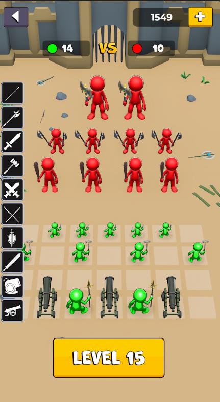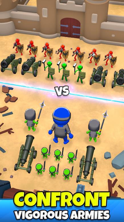 火柴人战争指挥官游戏是一款战争策略游戏,扮演一名指挥官,集合不同的兵种率领你的火柴人军团,进攻城堡,左右移动大炮完成射击,消灭所有的军团。在游戏中,你需要合理地选择你的兵种并进行组合,打造一支强大的火柴人军团。每一种兵种都拥有自己的优缺点,根据地图的不同情况选择最适合的兵种进行进攻或防御。