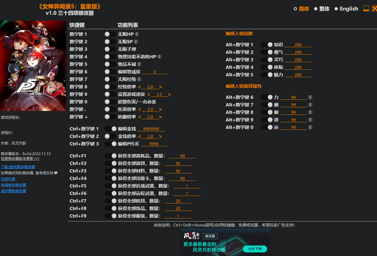 女神异闻录5皇家版修改器这是款功能丰富的游戏辅助工具,专为喜欢女神异闻录5皇家版的玩家打造,这里包括了无限HP、无限子弹、无限经验和一击必杀等三十四项功能,玩起来欢乐多多,喜欢的朋友快来这里下载吧!