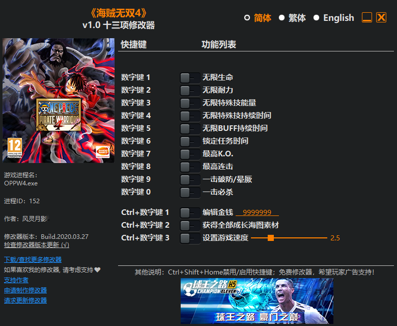 海贼无双4这是款非常刺激好玩的动作冒险游戏,为了让广大玩家能够有一个更好的游戏体验,小编今天为大家提供了风灵月影制作的修改器,里面包含了十三项功能可供免费使用,心动的朋友快来下载体验吧!!