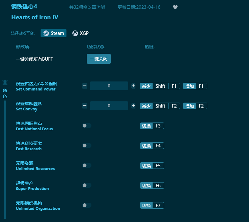 钢铁雄心4修改器是一款功能非常全面的同名游戏辅助修改工具,借助此修改器玩家可以对游戏中俄参数进行自由的修改,如无限人力、无限政治权利、无限指挥力等多达26项修改辅助功能,全部免费使用。有需要的小伙伴快来下载钢铁雄心4修改器试试吧!