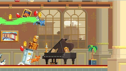 疯狂破坏猫(crashy cats)是一款以喵星人搞破坏为主要题材的跑酷休闲类游戏。玩家将扮演一只可爱的小猫,在各式各样的房间中肆意妄为,进行破坏行动。游戏的画面采用了q版像素风格,色彩鲜明,各种房间道具和破坏特效都设计得十分精致,配合上欢乐的音乐和猫咪的萌萌叫声,让人沉浸其中。