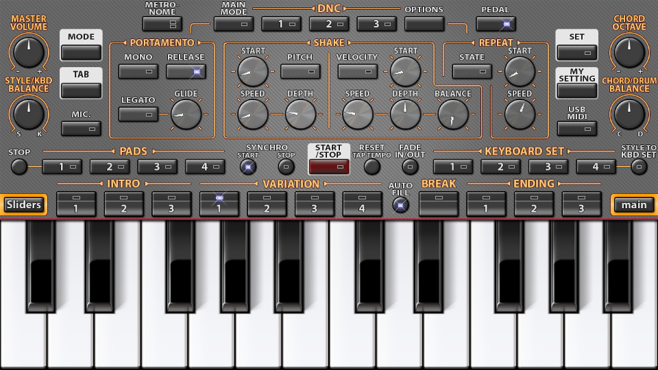 模拟KORG键盘:Fade,Synchro,键盘设置,速度,移调,八度,平衡,调谐,分割,和弦记忆,分接速度/重置等。