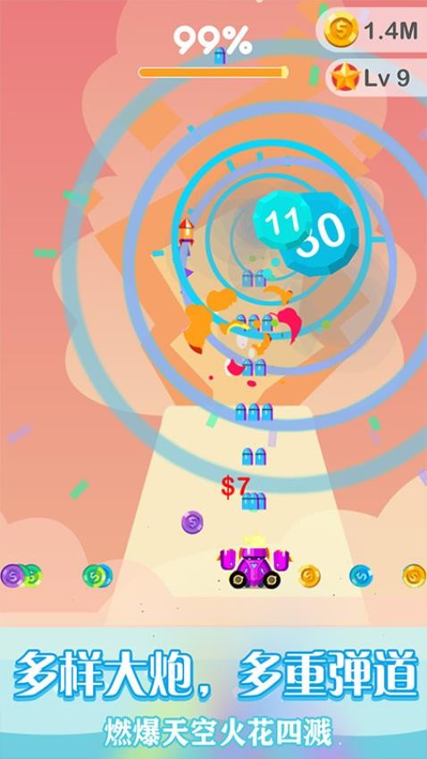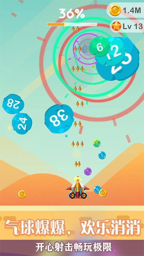 《气球爆爆》是一款精彩绝伦的手游APP,带您进入一个充满乐趣和挑战的射击世界。以下是对该游戏APP的精彩介绍:1. 独特的射击玩法:《气球爆爆》以射击为主要玩法,让您感受到无穷的乐趣和挑战。您需要准确地瞄准并射击各种形状和颜色的气球,以获得高分和奖励。每个气球都有不同的特点和行为,让您在射击过程中保持警觉和灵活应对。2. 多样化的关卡设计:游戏中设有多个精心设计的关卡,每个关卡都有不同的布局和难度。您将面临各种挑战,如移动的气球、障碍物和限时任务等。通过不断挑战和突破关卡,您可以提高自己的射击技巧和反应能力。3. 丰富的道具和技能:在游戏中,您可以通过收集金币和完成任务来解锁各种道具和技能。这些道具和技能可以帮助您更好地应对各种挑战,如增加射击精度、提高射速和炸弹爆破等。善于运用道具和技能,将使您在游戏中更加游刃有余。4. 精美的画面和音效:《气球爆爆》采用了精美的画面和优质的音效,为您呈现一个色彩斑斓、充满活力的游戏世界。每个气球都有生动的动画效果,让您射击的过程更加有趣和享受。5. 挑战排行榜和成就系统:游戏中设有排行榜和成就系统,让您可以与全球玩家进行比拼和竞争。通过不断提高自己的分数和完成特定任务,您可以获得丰厚的奖励和荣誉,并在排行榜上展示您的实力。《气球爆爆》是一款令人上瘾的休闲射击游戏,无论您是想放松身心还是挑战自我,都能在这个游戏中找到乐趣。快来下载并加入这个充满欢乐的射击世界,展示您的射击技巧和反应能力吧! 气球爆爆是一款以射击为主要玩法的休闲类闯关游戏。游戏中玩家利用手中的武器对空中的气球进行扫射,以不同阵型落下来的气球会对你的操作有一定的影响,因此在操作的时候还要根据气球来调整武器的位置。拥有非常独特的玩法,让玩家在挑战中体验到极其全新的内容,通过射击的方式来获得你的胜利,还需使用巧妙的控制方式,可以避免出现一些意外。气球上的数字代表了玩家需要击中的次数,只要满足了这个条件,气球就会消失,最好使用带有多种射击方式的武器,这样可以节省子弹。如果你也对这款游戏感兴趣的话,快下载吧!