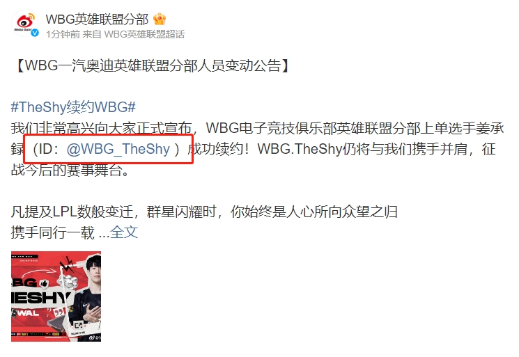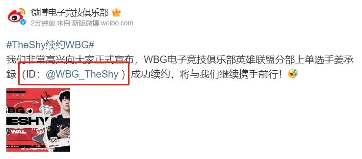 刚刚WBG官方正式宣布上单选手TheShy续约的消息,值得一提的是在本条微博内容中,WBG的微博运营@错人,@成了一位与TheShy微博名称接近的网友,后续官方删除该篇内容重新发布。