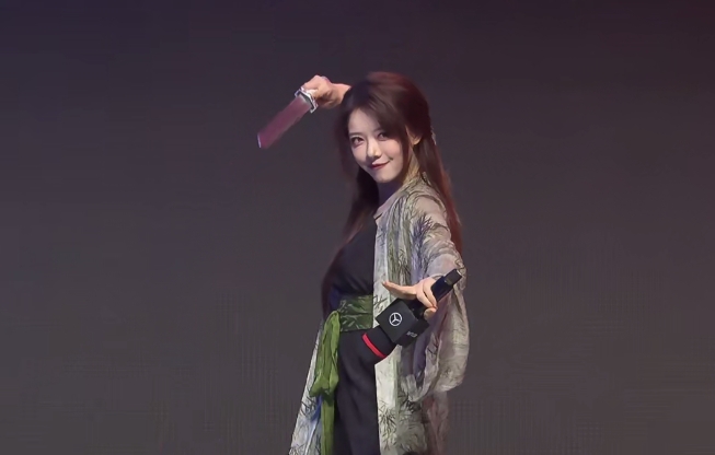 英姿飒爽驼子姐!骆歆古风黛绿穿搭,女侠造型手挽剑花